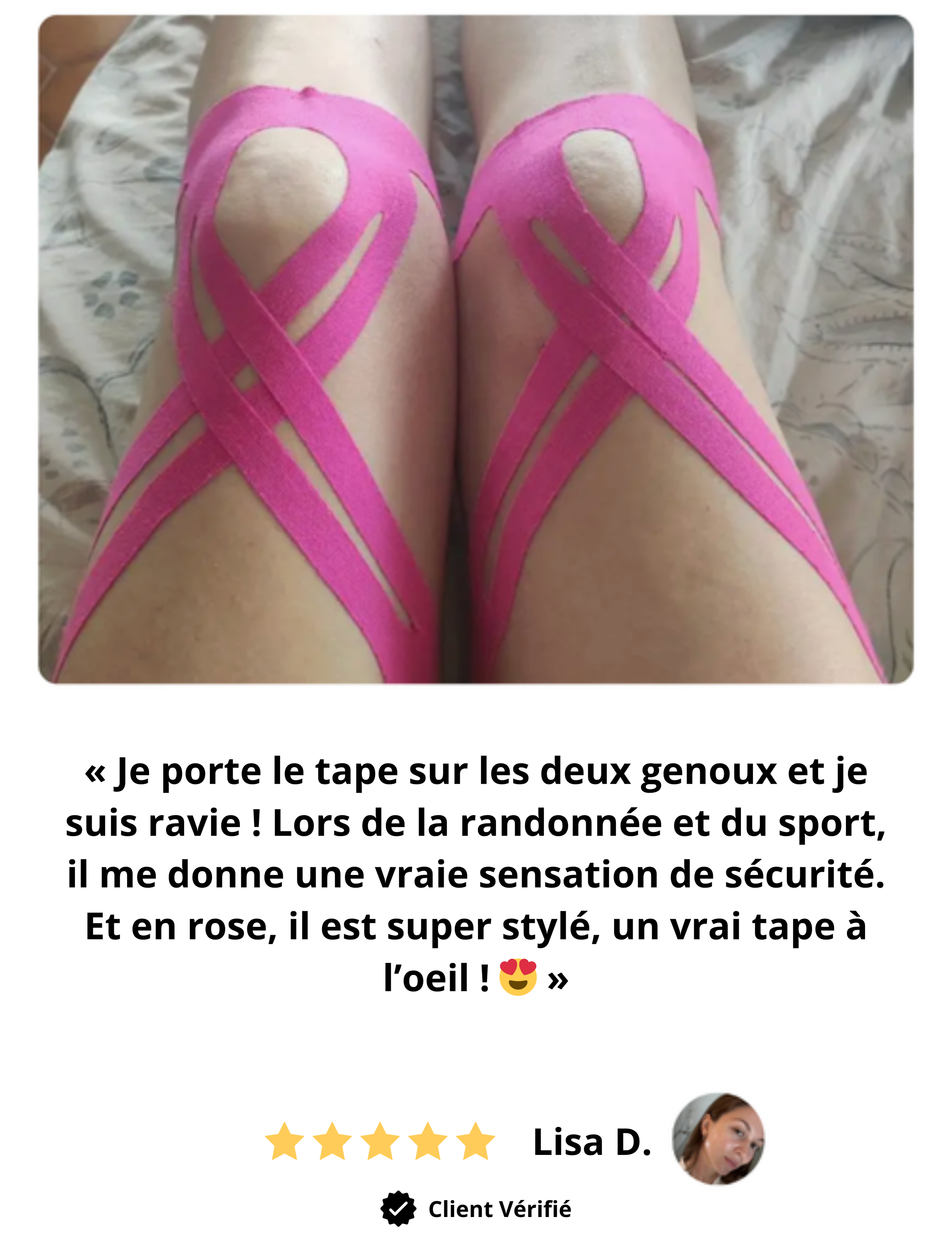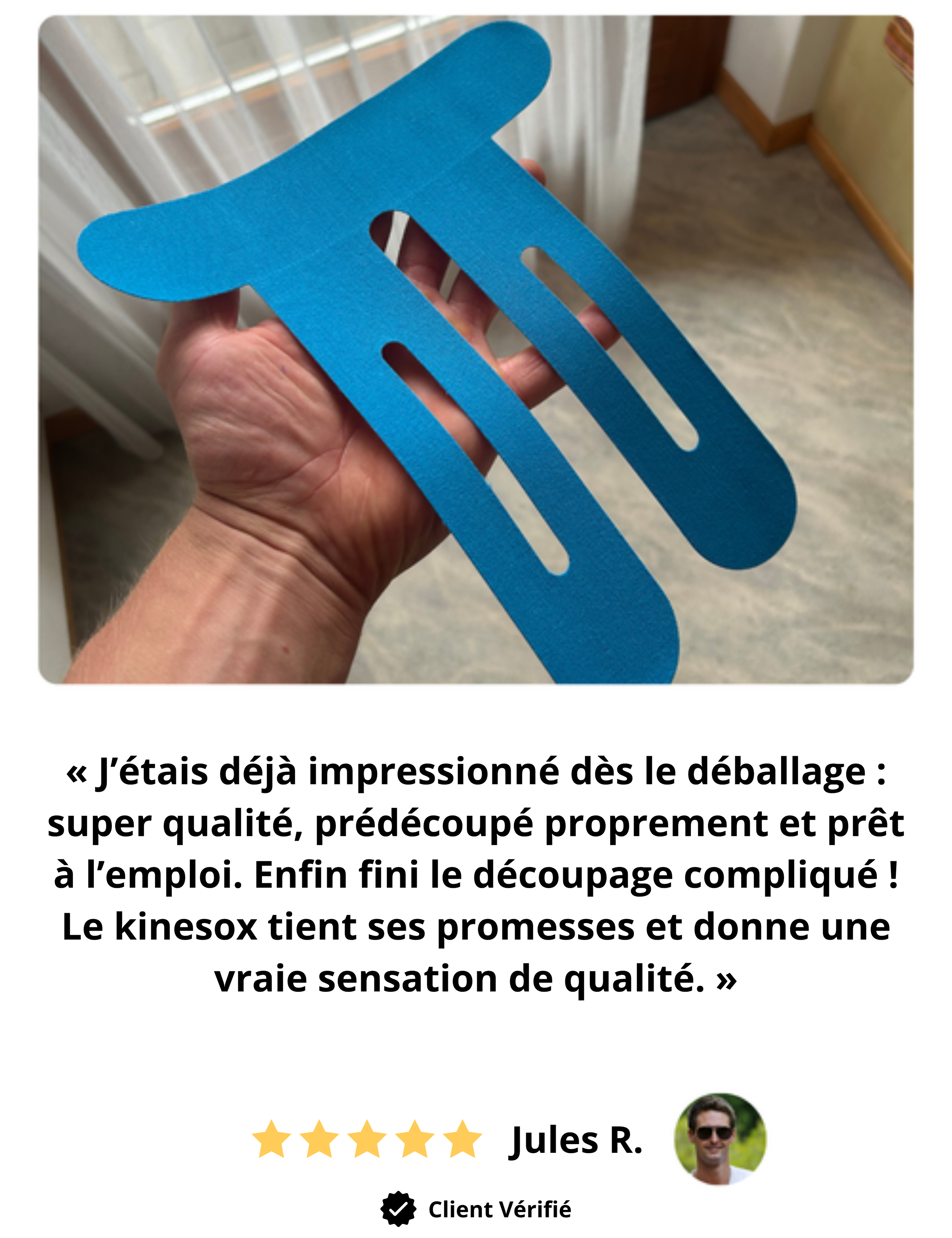 Nos tapes ont été développés avec des kinésithérapeutes et sont déjà parfaitement prédécoupés. Il suffit de décoller, d’appliquer, et tu ressens immédiatement plus de stabilité et un soulagement de la douleur.