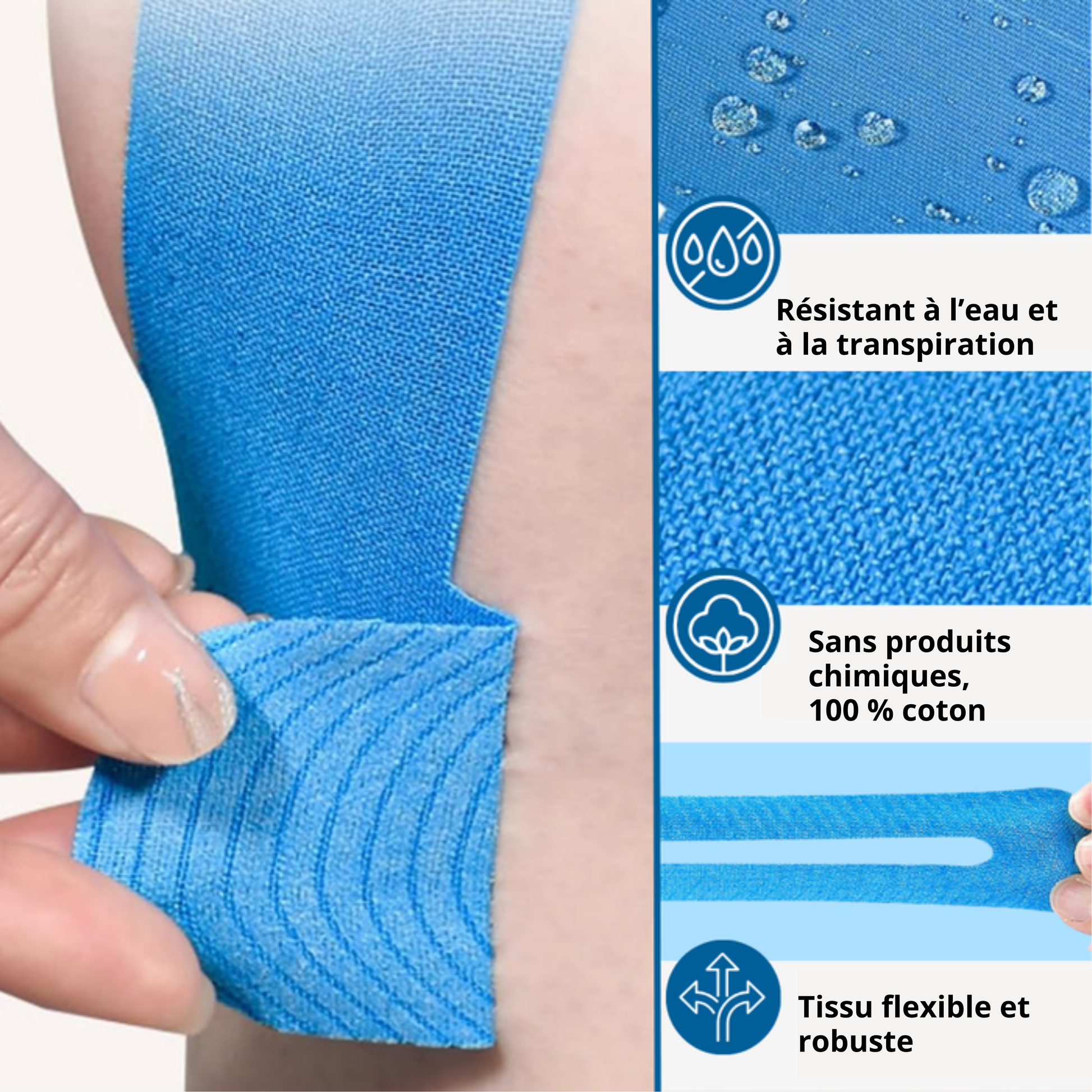 Nos tapes sont résistants à l’eau, respirants et très adhésifs. Cela signifie qu’ils tiennent plusieurs jours, même avec du mouvement, de la transpiration ou sous l’eau. Que vous faites du jogging, du vélo ou que vous prennez une douche – Kinesox™ reste bien en place sans se décoller.